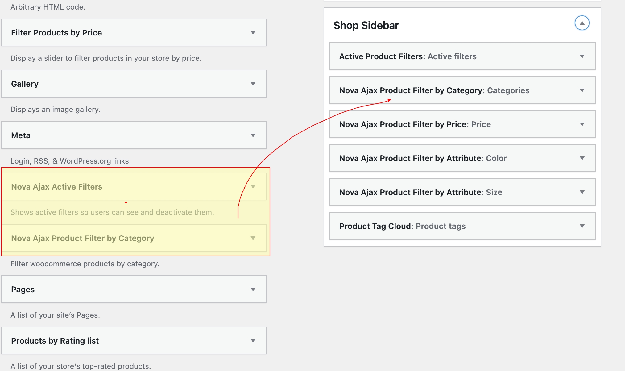 2. Add new filter widgets from the Available Widgets section by dragging them to the Sidebar you want to customize.